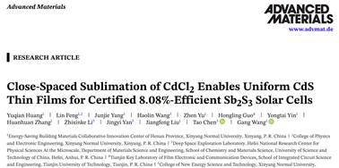 近日,信阳师范大学建筑节能材料河南省协同创新中心王刚博士团队在硫化锑太阳能电池研究领域取得重要进展,相关成果以“Close-Spaced Sublimation of CdCl2 Enables Uniform CdS Thin Films for Certified 8.08%-Efficient Sb2S3 Solar Cells”为题发表在《Advanced Materials》杂志上。信阳师范大学为该论文的第一完成单位,王刚博士为第一通讯作者,黄玉茜博士为第一作者和共同通讯作者,硕士研究生冯琳为文章第二作者。